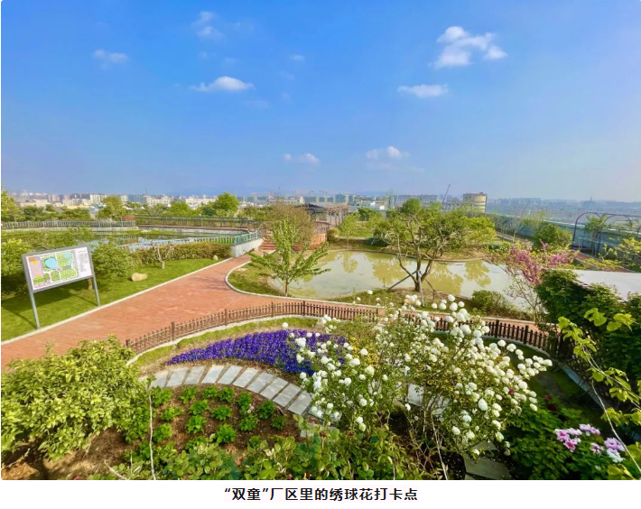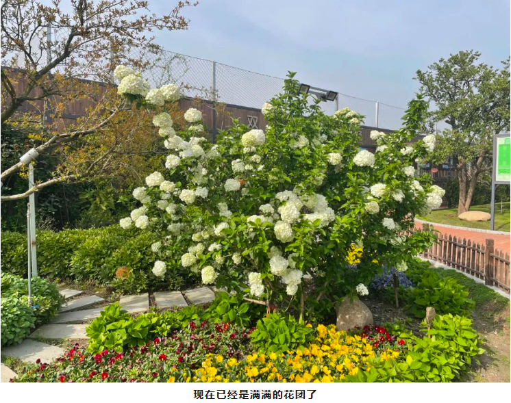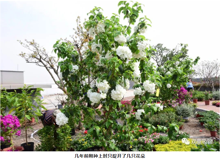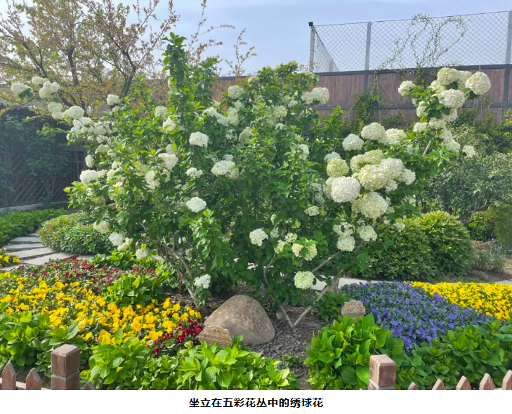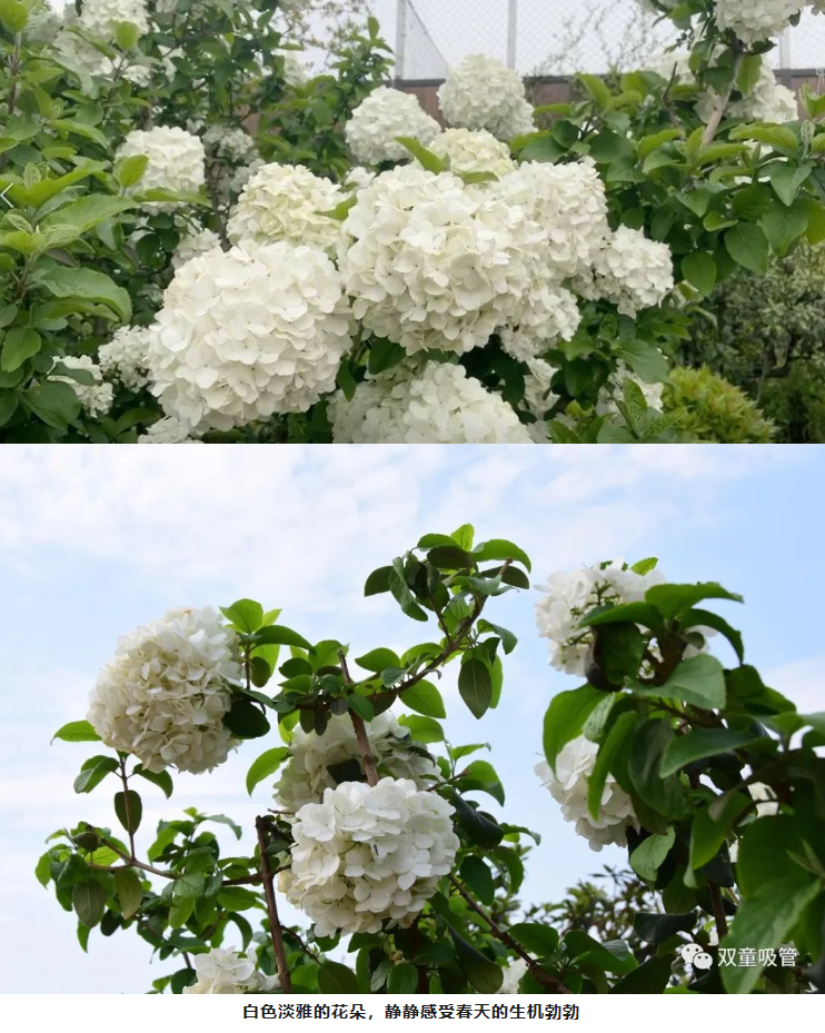 一進入“雙童”空中花園,就能看到群花斗艷。在萬紫千紅里,一顆白色的花樹尤其顯眼。繡球花盛開在春季,其余時間都是綠色枝丫。每年的四月是最佳觀賞期,也就是說,現(xiàn)在想一覽好風光的可要抓緊時間啦!