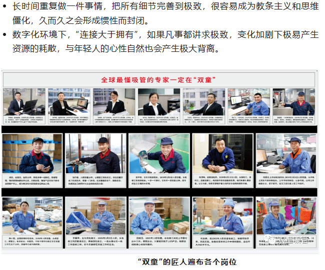 實(shí)際上,自1997年開(kāi)始,樓仲平結(jié)識(shí)時(shí)年已70高齡的日本友人桑原道昭先生。后又在其持續(xù)影響下隨先生到日本各地參訪(fǎng)、交流;2001年起受日本“利他經(jīng)營(yíng)、人本經(jīng)營(yíng)”的影響,決定逐步引進(jìn)在“雙童”實(shí)踐。而在學(xué)習(xí)吸收日本匠人精神的過(guò)程中,樓仲平也看到了其在數(shù)字化時(shí)代背景下的局限性:
