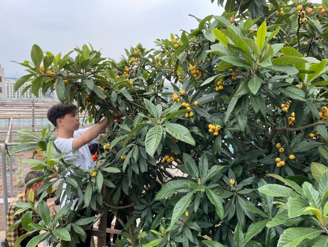 瞧!在“雙童”空中花園的枇杷林,一棵棵枇杷樹上爬滿了黃澄澄的枇杷,把樹枝都?jí)簭澙玻×4箫枬M的枇杷果肉都快撐破果皮,讓人看著直流口水,巴不得一躍而上,盡情品嘗這美味!