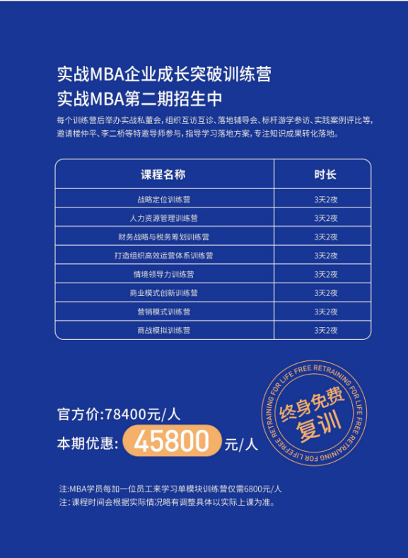 雙童商學(xué)院實戰(zhàn)MBA,摒棄紙上談兵,聚焦民營企業(yè)實際經(jīng)營管理問題,即學(xué)即用,邊學(xué)邊練,現(xiàn)場生成落地改進(jìn)方案。MBA包含戰(zhàn)略定位、人力資源管理、情境領(lǐng)導(dǎo)力等八大訓(xùn)練營,讓同學(xué)課上學(xué),課后用;今天學(xué),明天用!