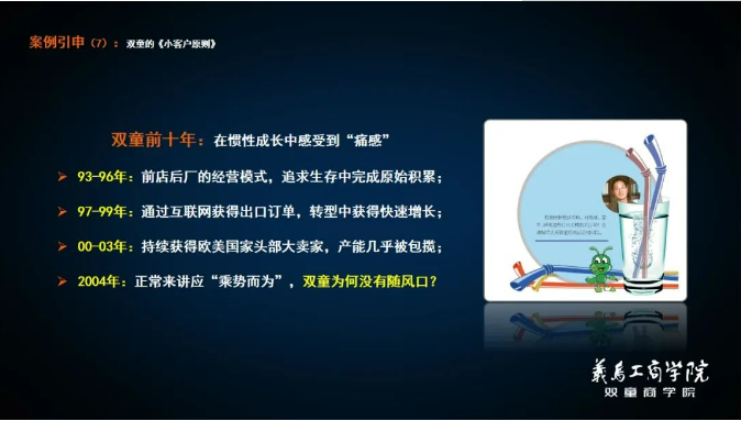 那么,“雙童”是如何通過錯位競爭一步步成為行業(yè)“隱形冠軍”的呢?? 揚(yáng)長避短,錯位創(chuàng)新早在2004年,“雙童”就刻意避開工業(yè)配套類吸管這個賽道,打破“吸管就是喝飲料的”基本假設(shè),通過要素創(chuàng)新,掌握了全球吸管產(chǎn)業(yè)2/3的專利,一步步進(jìn)入吸管產(chǎn)業(yè)鏈的頂端。長期堅(jiān)持的標(biāo)準(zhǔn)化戰(zhàn)略之路,也讓“雙童”在制定標(biāo)準(zhǔn)的過程中,牢牢掌握了一定的行業(yè)話語權(quán)和規(guī)則制定權(quán)!錯位競爭就是要企業(yè)避開巨頭和領(lǐng)先企業(yè)占據(jù)主導(dǎo)地位的正面競爭,圍繞自己可能的擅長,尋找到合適的錯位,建立自己的競爭優(yōu)勢。從1997年開始,“雙童”已經(jīng)充分利用互聯(lián)網(wǎng)技術(shù),外貿(mào)出口比例一度達(dá)到90%以上。但“雙童”意識到,所謂的“大客戶”,不僅利潤低下,還嚴(yán)重?cái)D壓了企業(yè)優(yōu)質(zhì)中小客戶的訂單,對企業(yè)未來發(fā)展是很不利的。從2004年開始,“雙童”開始慢慢放棄“大客戶”,繞開習(xí)慣依賴的經(jīng)驗(yàn)主義,轉(zhuǎn)而推行“小客戶原則”。通過戰(zhàn)略轉(zhuǎn)變,“雙童”把原先每100根吸管僅8分錢的利潤,提升到了有20%以上利潤率的提價空間,牢牢掌握了“雙童經(jīng)營的主動權(quán)。