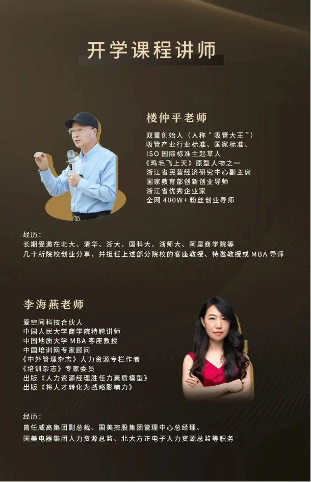 此次開學課程,樓仲平老師將為大家?guī)砭拇蚰サ恼n程分享,并盛邀著名管理學講師李海燕老師作為嘉賓老師,為來自各行各業(yè)的同學們賦能。