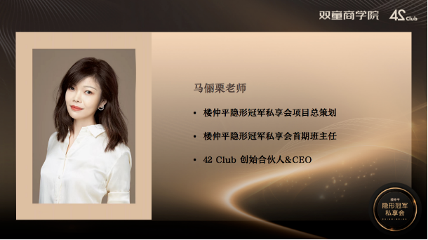同時受樓仲平老師的邀請,42Club 創(chuàng)始合伙人&CEO馬儷栗將擔任“樓仲平·隱形冠軍私享會”項目運行總策劃人,以及項目交付的班主任老師。