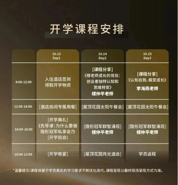 樓仲平·隱形冠軍私享會第一模塊課程時間為三天兩夜,樓仲平老師將分享其成長背后的底層邏輯《創(chuàng)業(yè)者獨特認知和思維轉(zhuǎn)變》,李海燕老師則帶來《認知自我、蝶變成長》課程分享。