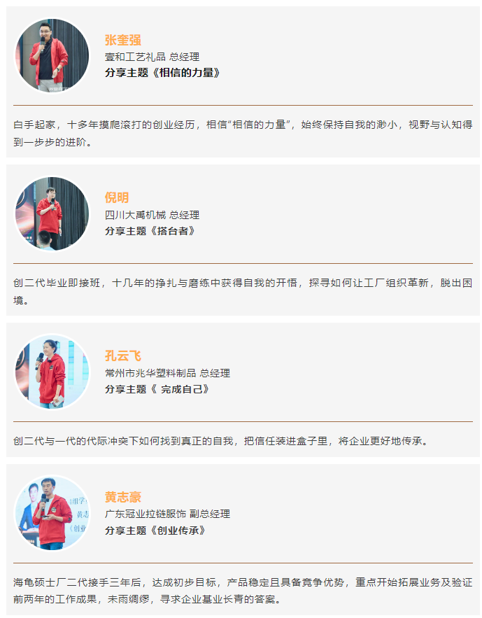 因此,在開學(xué)典禮上,四位具有代表性的學(xué)員分享介紹了自己在企業(yè)經(jīng)營的心路歷程,并表達(dá)了升級思維的期待,解決目前的企業(yè)傳承與轉(zhuǎn)型發(fā)展問題。