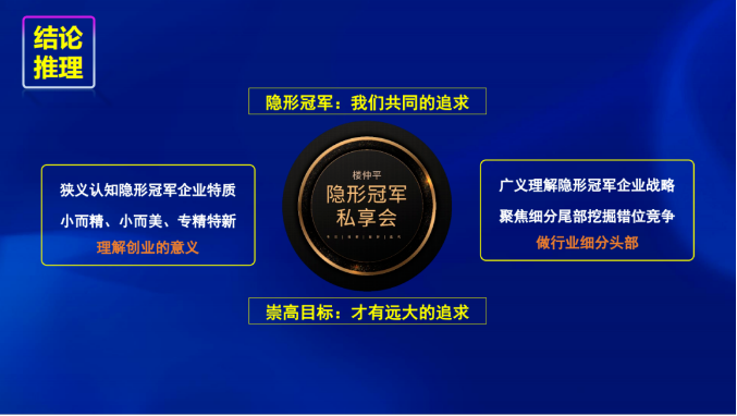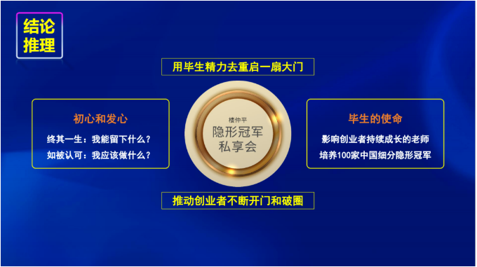 “樓仲平隱形冠軍私享會”是以樓仲平老師的名字作為背書的一個小范圍思想圈子,將成為他一生中最為重要的思想載體,宗旨為推動創(chuàng)業(yè)者不斷開門和破圈,成長為“隱形冠軍”。這樣崇高而遠大的目標,需要創(chuàng)業(yè)者由心出發(fā),認知成長。