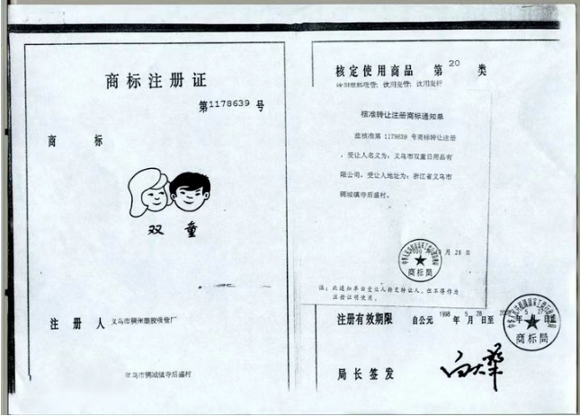 那時(shí)很多企業(yè)還沒(méi)有商標(biāo)的概念,樓仲平走在了前列,他的“雙童”牌,成了整個(gè)義烏的第17個(gè)商標(biāo)。