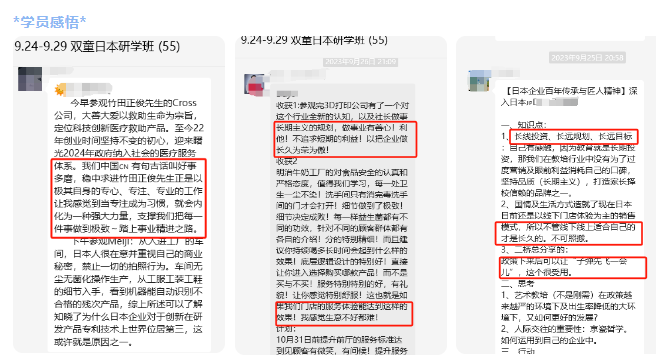 兩期日本企業(yè)游學(xué)之旅,很多學(xué)員都深受啟發(fā),在貫穿研學(xué)全程的巴士課堂上大家暢所欲言,分享所見所得所想。無論是從巴士課堂上的分享發(fā)言、還是從形成文字感悟來看,都能看出來大家收獲滿滿!