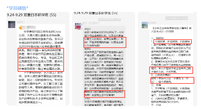 兩期日本企業(yè)游學(xué)之旅,很多學(xué)員都深受啟發(fā),在貫穿研學(xué)全程的巴士課堂上大家暢所欲言,分享所見所得所想。無論是從巴士課堂上的分享發(fā)言、還是從形成文字感悟來看,都能看出來大家收獲滿滿!