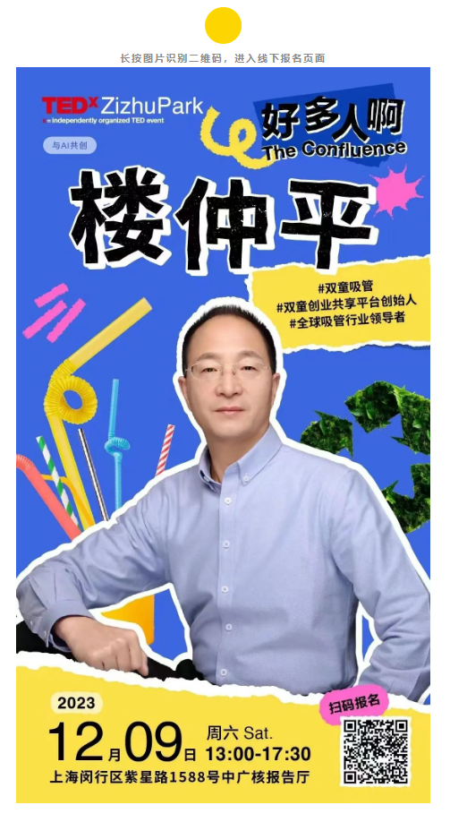 “雙童”創(chuàng)始人樓仲平作為企業(yè)家,關注員?生活與工作的每?處細節(jié),在成為吸管行業(yè)領導者的同時,還打造了一家“花園式”工廠,在推動工廠節(jié)能減排建設中做了很多的努?。TEDxZizhuPark組織方敏銳地捕捉到其在商業(yè)領域的成就,特邀作為開場嘉賓演講人分享。