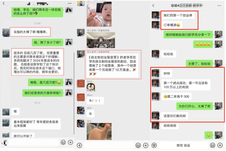 為了能夠助力更多中小企業(yè)也能運用這套機制實現(xiàn)快速增長,雙童商學院早在2022年,雙童商學院就針對該機制打磨成《自主制創(chuàng)業(yè)裂變營》課程,并不斷地升級迭代,該課程已經是一套非常成熟的、可復制、可實踐的課程,完全契合中小微創(chuàng)業(yè)者的需求,報名人數也從原來的幾十人變成現(xiàn)在期期爆滿的“百人團”!