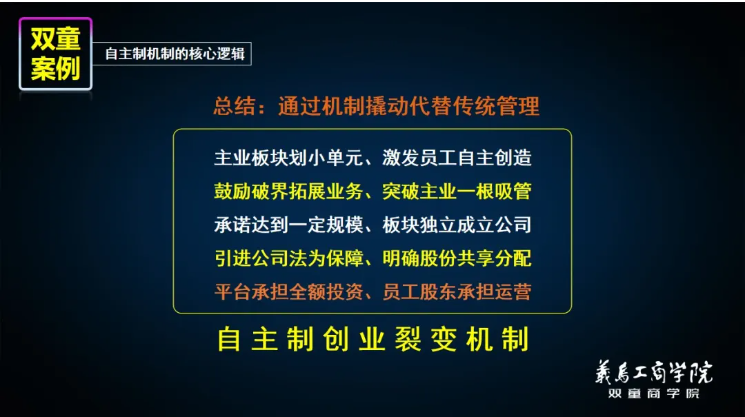 所以,學員企業(yè)在成立創(chuàng)業(yè)平臺時,完全可以借鑒“雙童”的模式,先扶持成立“標桿”創(chuàng)業(yè)體,再以點帶面,推動更多員工創(chuàng)業(yè)!