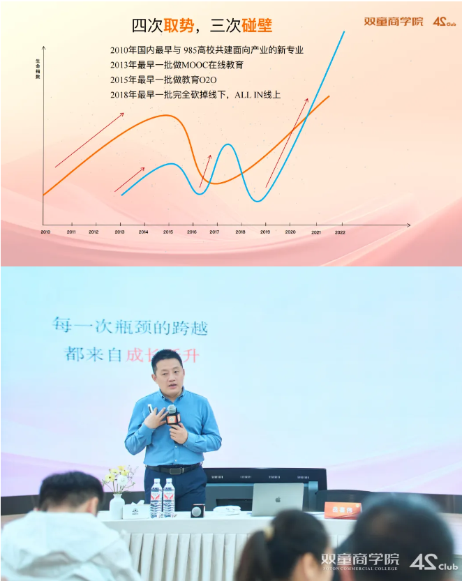 岳喜偉老師在課堂上分享了慧科集團(tuán)通過“四次取勢,三次碰壁”,花費(fèi)6年的時間探索,才形成了企業(yè)的“第二曲線”,而這期間企業(yè)遇到的每一次“瓶頸期”和實(shí)現(xiàn)的突破都源自于創(chuàng)業(yè)者的認(rèn)知局限和成長躍升!