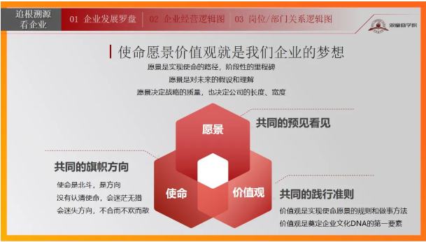 “追根溯源看企業(yè)”旨在讓參訓學員明確自己企業(yè)發(fā)展目標、夢想,并推動目標的實現(xiàn);正確認知企業(yè)經營現(xiàn)狀,明確企業(yè)盈利的關鍵點和卡點;掌握科學合理地劃分部門與崗位的依據(jù)和方法。