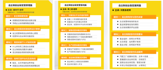 理論是實踐的基礎(chǔ),先弄清楚機制的運行原理,才能談得上有效實踐!所以在課程交付過程中,講師樓仲平會花費一整天的時間,將課程干貨分為四大模塊,共11小節(jié),為學(xué)員深度解析自主制創(chuàng)業(yè)裂變的機制原理!