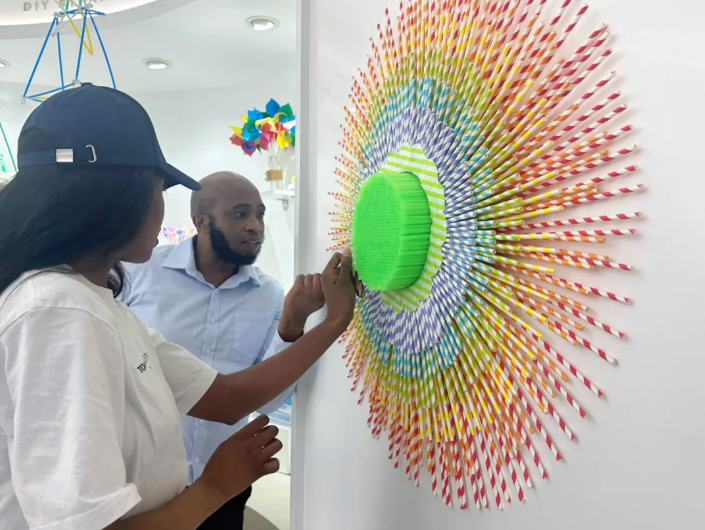 在探索創(chuàng)新產(chǎn)品體驗區(qū)和DIY吸管展示區(qū)的奇妙之旅中,各式各樣的吸管猶如藝術(shù)品般映入眼簾:活靈活現(xiàn)的動物卡通吸管、內(nèi)置風輪隨水輕舞的風車吸管、由吸管搭建出的形態(tài)各異的模型……