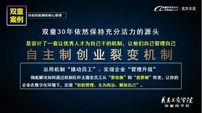 烏卡時(shí)代下,樓仲平意識(shí)到數(shù)字化只是一種技術(shù)、一個(gè)工具,最終是服務(wù)于人的。它為員工提供工作便利的同時(shí),也讓傳統(tǒng)雇傭關(guān)系面臨瓦解。面對(duì)數(shù)字化挑戰(zhàn),“雙童”決定結(jié)合多種組織機(jī)制和中小企業(yè)的特點(diǎn),自制了一套適用于中小企業(yè)的組織創(chuàng)新制度——自主制創(chuàng)業(yè)裂變機(jī)制,讓員工從“要我做”到“我要做”轉(zhuǎn)變。