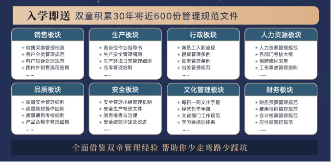 所以,入學“隱形冠軍樓仲平思享薈”之后,項目組會將“雙童”積累了30年、包含了銷售、生產(chǎn)、行政、人類資源、品質(zhì)、安全和文化管理7大板塊,將近600分管理規(guī)范文件,全部打包給學員,幫助學員企業(yè)能夠全面借鑒雙童管理經(jīng)驗、少走彎路、少踩坑!