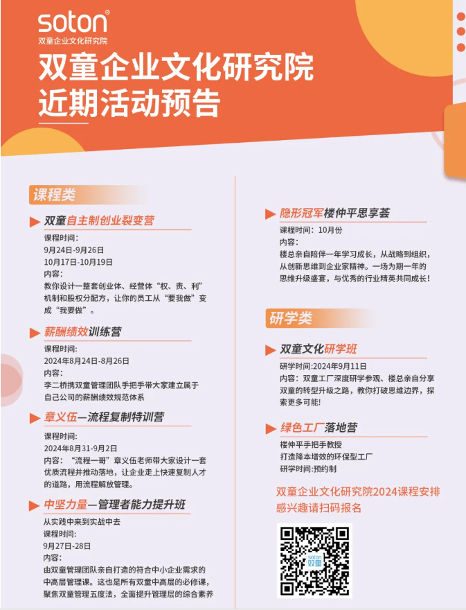 如果你也對(duì)“雙童”充滿好奇,也想賦能團(tuán)隊(duì)共同成長(zhǎng),歡迎走進(jìn)9月11日【雙童文化研學(xué)班】,與上百位優(yōu)秀的創(chuàng)業(yè)者一起學(xué)習(xí)!少量名額,歡迎咨詢鎖定!