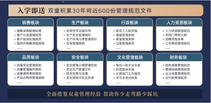 所以,入學(xué)“隱形冠軍樓仲平思享薈”之后,項(xiàng)目組會(huì)將“雙童”積累了30年、包含了銷(xiāo)售、生產(chǎn)、行政、人類(lèi)資源、品質(zhì)、安全和文化管理7大板塊,將近600分管理規(guī)范文件,全部打包給學(xué)員,幫助學(xué)員企業(yè)能夠全面借鑒雙童管理經(jīng)驗(yàn)、少走彎路、少踩坑!