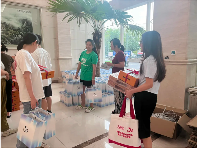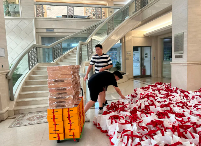 中秋節(jié)雖然還沒(méi)有來(lái)臨,但后勤部門一早就已經(jīng)開(kāi)始了熱火朝天的準(zhǔn)備工作,將一盒盒精心準(zhǔn)備的月餅、水果、吸管禮盒、雙童文創(chuàng)裝入禮品袋中。