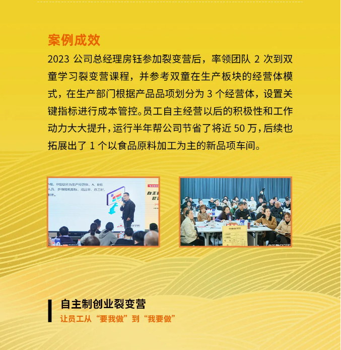 而《自主制創(chuàng)業(yè)裂變營》就是依托該機制,把“雙童”的落地實操方法與成功經(jīng)驗經(jīng)驗有機結(jié)合,不斷打磨、升級的一套針對中小微企業(yè)的管理課程。
