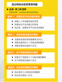 落地實操篇則由雙童總經(jīng)理李二橋進行交付!作為裂變機制的執(zhí)行者,他以雙童內(nèi)部對裂變機制的實際運行狀況為案例教材,將課程分為五大模塊,16個小節(jié),盡可能最詳細、最全面地交付給學(xué)員操作方法!
