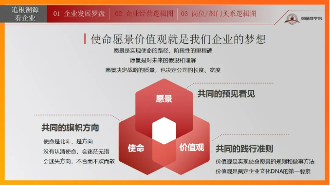 “追根溯源看企業(yè)”旨在讓參訓(xùn)學(xué)員明確自己企業(yè)發(fā)展目標(biāo)、夢想,并推動目標(biāo)的實現(xiàn);正確認(rèn)知企業(yè)經(jīng)營現(xiàn)狀,明確企業(yè)盈利的關(guān)鍵點和卡點;掌握科學(xué)合理地劃分部門與崗位的依據(jù)和方法。