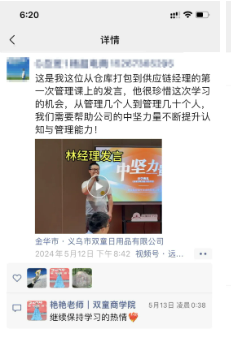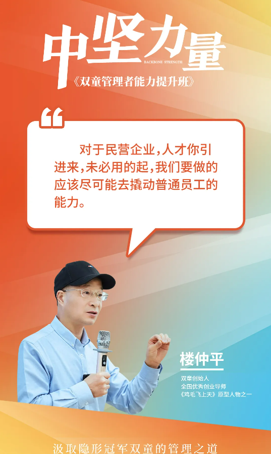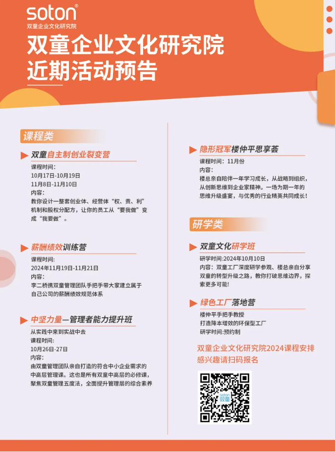 因為學(xué)員們的信任和課程的實用性,剛開課,朋友圈就被學(xué)員們的代言刷屏了,這也讓《中堅力量》的全體課研人員更有使命感,更用心得去幫助學(xué)員搭建一直優(yōu)秀的管理隊伍!各位中小企業(yè)老板們,如果你也想把自己從大小瑣事中解放出來,也想要一支有活力、強要性的管理團隊,該課程學(xué)制為4個月,每月交付2天完成一個課程主題學(xué)習(xí),循環(huán)開班。10月26日-27日,歡迎到雙童商學(xué)院參加學(xué)習(xí)!