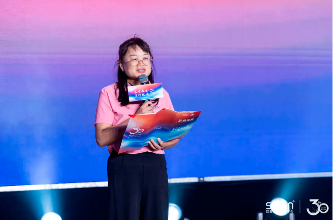 雙童三十周年慶典儀式上,員工代表張舍姣上臺分享