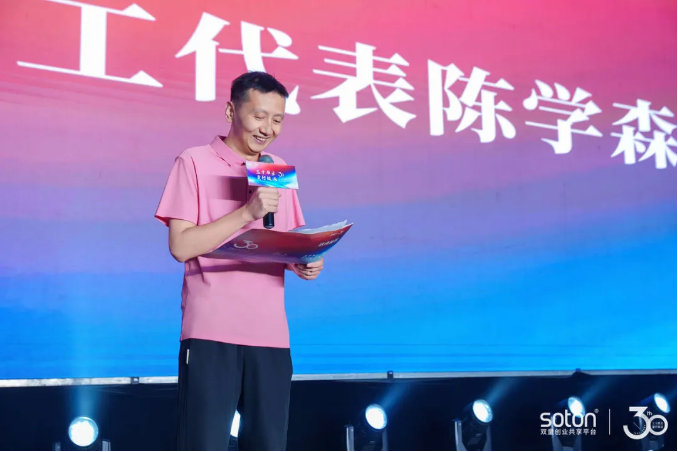 雙童三十周年慶典儀式上,員工代表陳學(xué)森上臺分享