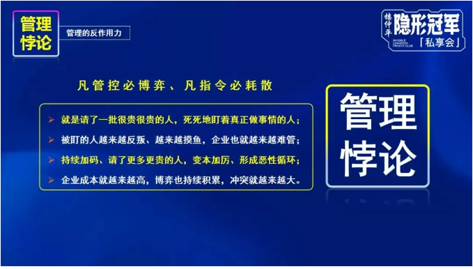 但是根據(jù)管理悖論,“凡管控必博弈,凡指令必耗散”,企業(yè)經(jīng)營真正的危險更多來源于內(nèi)部的耗散;企業(yè)管理真正的成本來源于成員之間的博弈。所以,當企業(yè)有一定規(guī)模之后,則要用治理的“疏”替代管理的“堵”。治理是在滿足人性訴求下,對管理的本身進行結(jié)構(gòu)優(yōu)化和激勵,通過“順人性”的規(guī)則和機制,激發(fā)員工對經(jīng)營結(jié)果承擔責任。