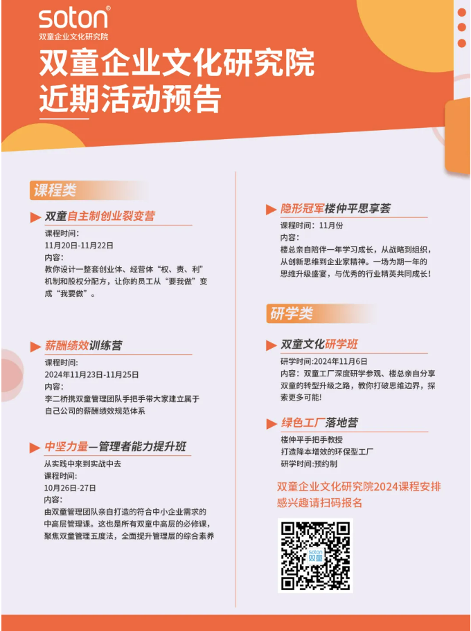 在雙童,從不避諱跟員工談錢,創(chuàng)始人樓仲平也在講課中多次跟創(chuàng)業(yè)者強調(diào):一定要跟員工多談錢,少談格局。老板的夢想不是員工的夢想,員工不應該也不會為老板的理想買單。當員工拿到的錢足夠多了,自然會與企業(yè)共進退。雙童的自主制創(chuàng)業(yè)裂變機制,正是通過增量共享的分配方式,讓員工“多拿錢”,從而自覺為企業(yè)“多辦事”!