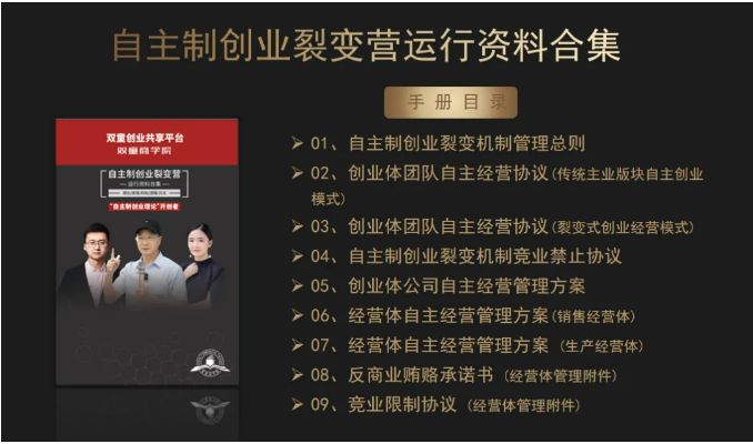3、交付自主制創(chuàng)業(yè)裂變模式的各項(xiàng)規(guī)則、文本、合同等書(shū)面資料
