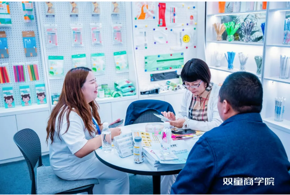 雙童商學(xué)院的工作人員在向客商介紹學(xué)習(xí)內(nèi)容