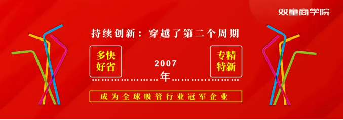 通過(guò)打破“吸管只能用來(lái)喝水”的隱含假設(shè),運(yùn)用創(chuàng)新思維,讓吸管從單一的“喝水”功能向情感化、體驗(yàn)化和娛樂(lè)化延伸,滿足了中小客戶群體的定制化需求,開辟了一個(gè)獨(dú)屬于雙童的商業(yè)“藍(lán)?!?/span>!并通過(guò)持續(xù)的創(chuàng)新,讓雙童又穿越了一個(gè)周期,完成了從“多快好省”到“專精特新”的轉(zhuǎn)變,成為吸管行業(yè)當(dāng)之無(wú)愧的“隱形冠軍”!