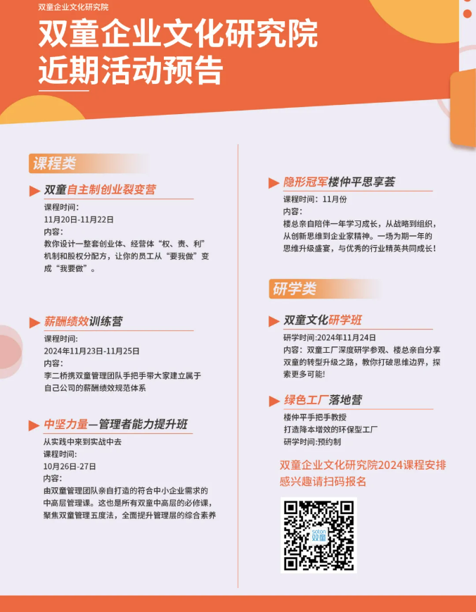 雙童的成長(zhǎng)歷程中,我們能清晰地感知到,樓總一直在尋求破界、創(chuàng)新,每當(dāng)企業(yè)趨于穩(wěn)定時(shí),他就會(huì)扮演“攪局者”的角色,打破現(xiàn)有的平衡。也正是這種“于無(wú)聲處聽驚雷”的未雨綢繆,才能讓雙童在每次危機(jī)來(lái)臨時(shí),都能成功“闖關(guān)”,穿越一個(gè)個(gè)成長(zhǎng)周期,希望能與更多企業(yè)經(jīng)營(yíng)者共勉!