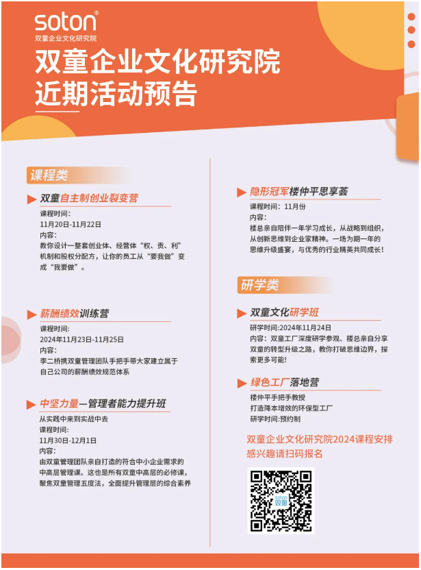 如果你也對“雙童”充滿好奇,也想賦能團隊共同成長,歡迎走進11月24日【雙童文化研學班】,與上百位優(yōu)秀的創(chuàng)業(yè)者一起學習!