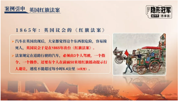 為了讓同學(xué)們更好理解為什么經(jīng)驗(yàn)具有時(shí)效性,樓老師在課程中引申了經(jīng)典的英國《紅旗法案》案例:英國人按照延續(xù)幾千年的馬車經(jīng)驗(yàn)來制定汽車的行路規(guī)范,導(dǎo)致英國汽車產(chǎn)業(yè)被抑制,從而被美國后來居上。