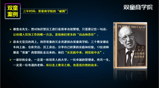 傳統(tǒng)管理中“胡蘿卜加大棒”的方式,對(duì)新生代年輕的員工逐漸失效。樓仲平以雙童商學(xué)院的“破圈“之路為例,論證了企業(yè)對(duì)新生代員工,更應(yīng)該 “尊重人性、順應(yīng)人心”,從而實(shí)現(xiàn)“心理動(dòng)機(jī),初心動(dòng)念”轉(zhuǎn)變,撬動(dòng)一批批的優(yōu)秀人才。