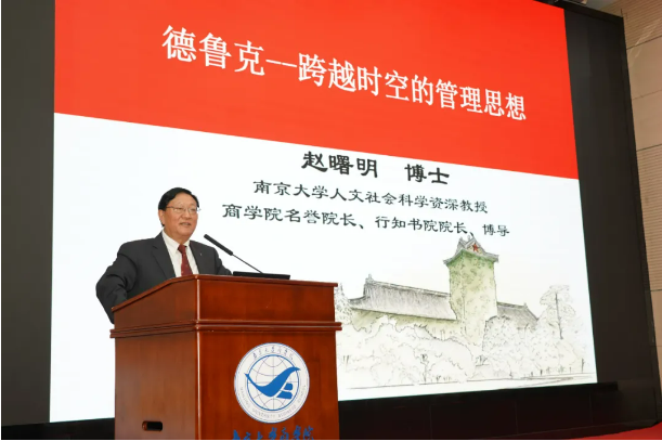 在論壇上,趙曙明教授從自身求學(xué)時(shí)與彼得·德魯克教授的交往、合作經(jīng)歷出發(fā),發(fā)表了名為“德魯克——跨越時(shí)空的管理思想”的主題演講。