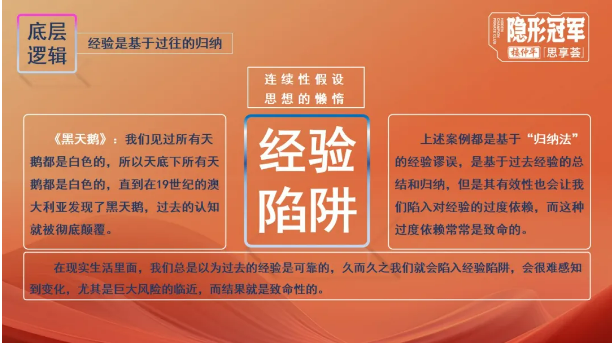 所以樓老師在課上,選用經(jīng)典的“黑天鵝”和“感恩節(jié)的火雞”作為教學案例,讓同學們明確認識到:經(jīng)驗的底層邏輯是基于過往的歸納,但世界是“非連續(xù)性”的,對過去的歸納總結對未來未必有效,想象力需要反叛精神。