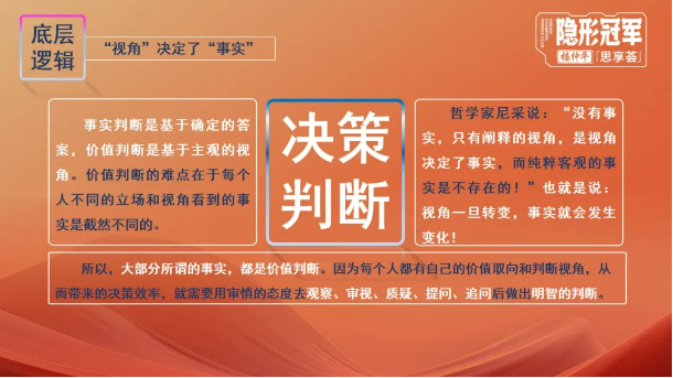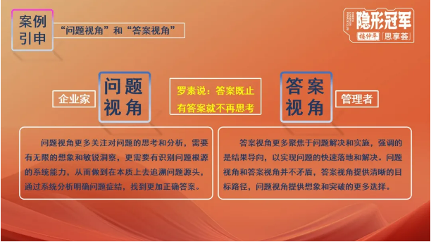 所以,比“事實”更重要的,是對事實的認知和運用抽象邏輯思考的方式。創(chuàng)業(yè)者在經(jīng)營企業(yè)的過程中,要學會用“問題視角”去思考分析,用審慎的態(tài)度去觀察、審視、質疑、提問、追問后做出明智的判斷。
