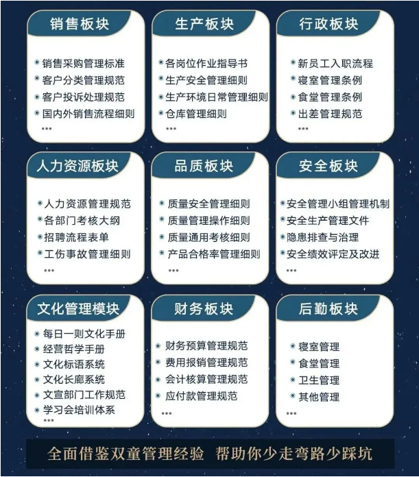 所以,入學“隱形冠軍樓仲平思享薈”之后,項目組會將“雙童”積累了30年、包含了銷售、生產(chǎn)、行政、人類資源、品質、安全、文化管理、財務和后勤等9大板塊,近600份管理規(guī)范文件,全部打包給學員,幫助學員企業(yè)能夠全面借鑒雙童管理經(jīng)驗、少走彎路、少踩坑!