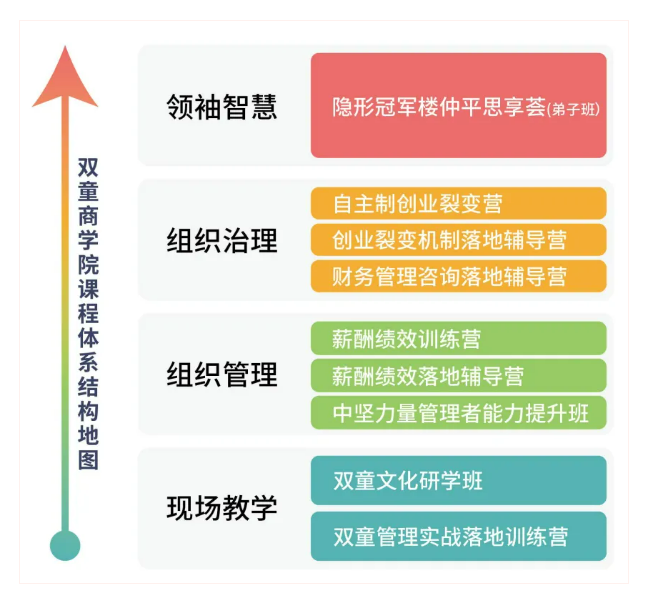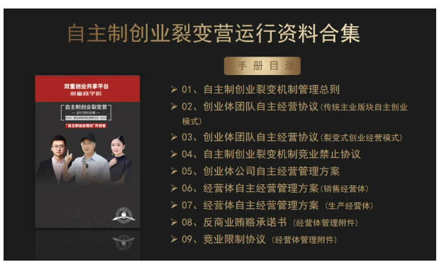 3)組織治理模塊:《自主制創(chuàng)業(yè)裂變營》專注于組織機(jī)制創(chuàng)新,幫助學(xué)員輸出一套企業(yè)組織創(chuàng)新方案,激發(fā)個(gè)體活力,推動(dòng)企業(yè)裂變式增長。