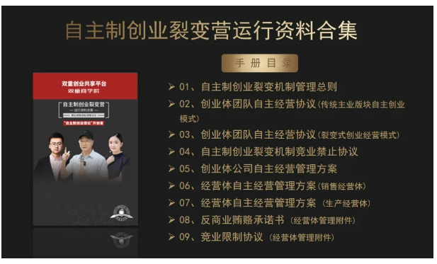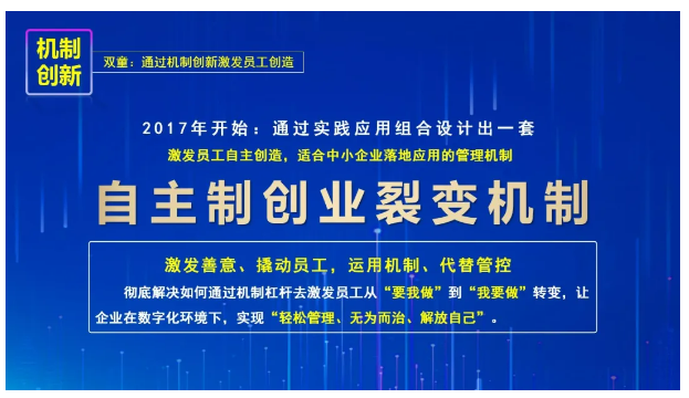 于是他果斷選擇破界創(chuàng)新,尋求企業(yè)發(fā)展的“第二曲線”,并結(jié)合多種組織機(jī)制和中小企業(yè)的特點,自制了一套適用于中小企業(yè)的組織創(chuàng)新制度——自主制創(chuàng)業(yè)裂變機(jī)制,搭建創(chuàng)業(yè)共享平臺,激發(fā)員工從“要我做”到“我要做”。