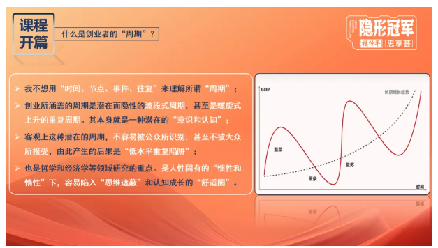 在良好的課堂氛圍下,樓老師的知識分享格外激情澎湃。為了讓大家更好地理解主題,在課程伊始,樓老師闡釋了“創(chuàng)業(yè)者周期”的定義,創(chuàng)業(yè)所涵蓋的周期是潛在而隱性的波段式周期,甚至是螺旋式上升的重復(fù)周期。
