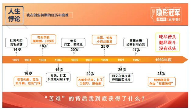 第一次穿越的周期,是在漫長的苦難中度過的。1978-1994年間,樓仲平先后林林總總“折騰”了近20多個行當,飽嘗了辛酸冷暖,最終專注投入“一根吸管”的事業(yè)。