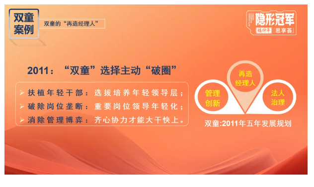 作為中國細分行業(yè)隱形冠軍企業(yè),“雙童”30年持續(xù)的創(chuàng)新和轉(zhuǎn)型,經(jīng)歷了從“作坊企業(yè)—專精特新--隱形冠軍—第二曲線”的全生命發(fā)展周期,更懂得中小企業(yè)在“隱形冠軍”之路中各個階段遇到的痛點、難點。
