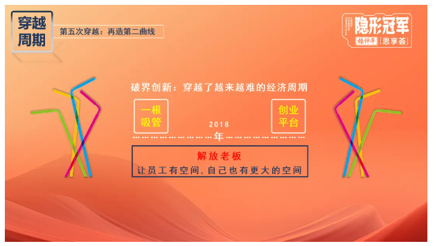 在危機之下,他毅然帶領(lǐng)“雙童”突破“一根吸管”的局限,突破路徑依賴,打開組織邊界,通過不斷嘗試摸索,獨創(chuàng)了一套適合中小企業(yè)的裂變增長的創(chuàng)新模式:將主業(yè)板塊作為創(chuàng)業(yè)共享平臺,拓展“第二曲線”反哺主業(yè)經(jīng)營。